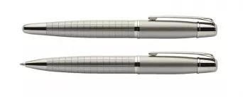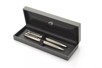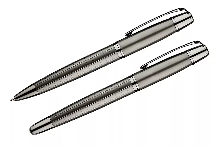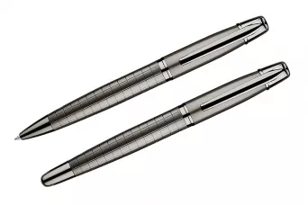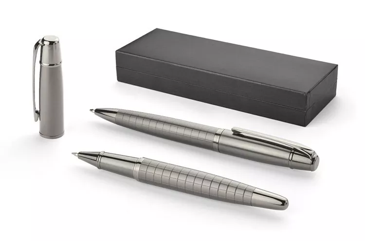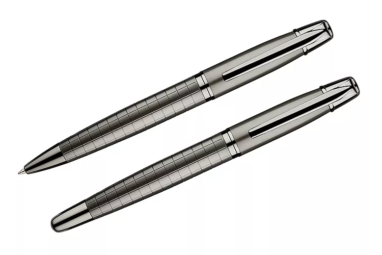 Elegancki zestaw prestiżowej marki GESSTOR cechującej produkty wysokiej jakości o unikatowym wzornictwie. Czarne pudełko zawiera długopis oraz pióro kulkowe w kolorze grafitowym. Oba elementy wykonane są w całości z metalu, w dolnej części ozdobione ciekawą fakturą kratki. Elementy posiadają oznaczenie marki Gesstor na końcówkach. Znakowanie jest możliwe na długopisach oraz na pudełku.